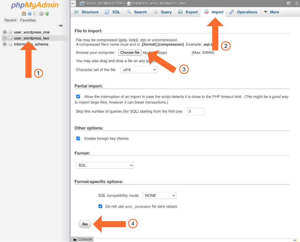 - In the File to import section, click Choose File and browse to the SQL file you just downloaded.