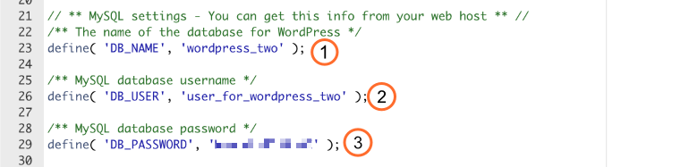 We need to edit several fields in the MySQL settings section of wp–config.php so that WordPress can access and authenticate with the new database.