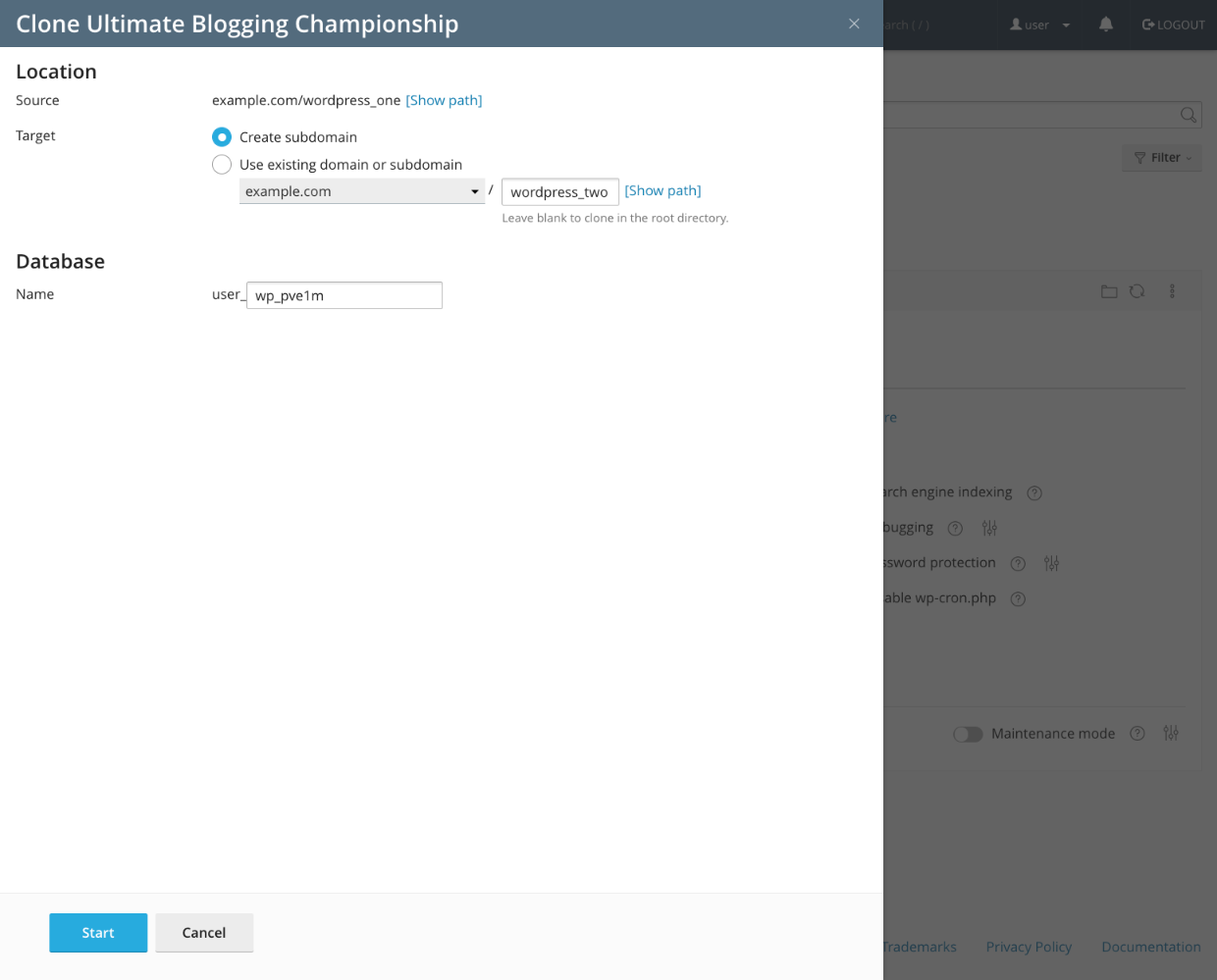 When the clone tool opens, select a subdomain and a path to clone the site to. If they don’t exist, WP Toolkit creates them for you. When you’re finished, click Start at the bottom of the page.