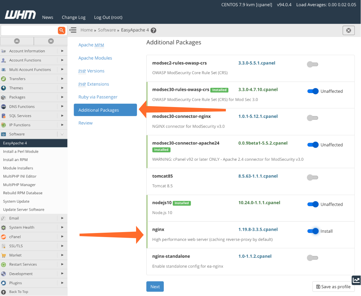 Click Additional Packages, and activate the switch next to NGINX.