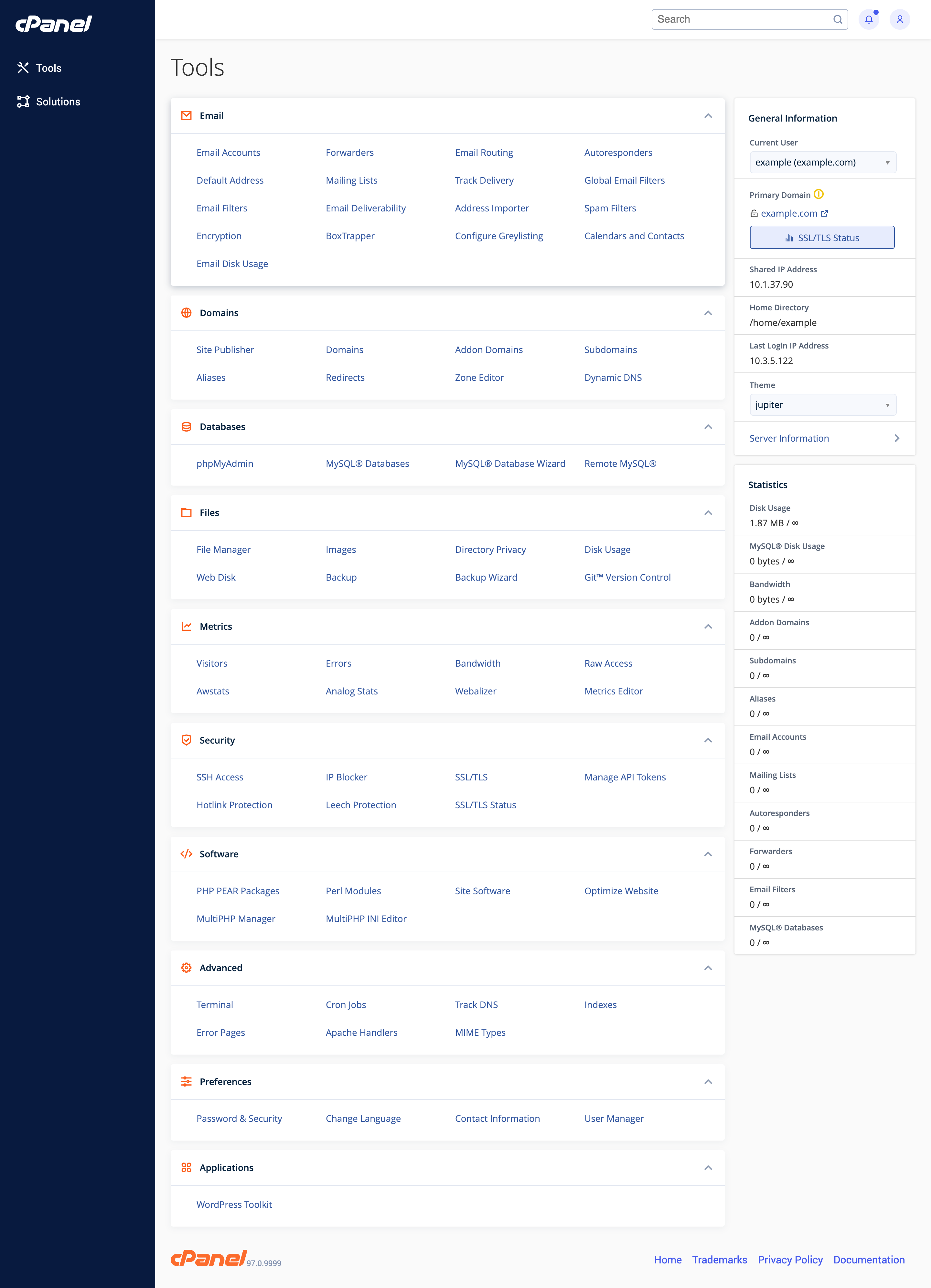 The Tools page will be familiar to experienced users. This is the default home page. We’ve listed cPanel’s applications and grouped them into categories. Like in Paper Lantern, you can click on and drag these groups to arrange them in any order. On the right sidebar, the General Information and Statistics panels display website and server information at a glance.