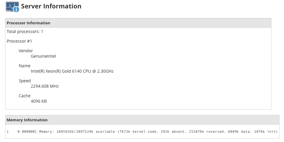 The Server Information page displays basic data that includes hardware and details about resource consumption.