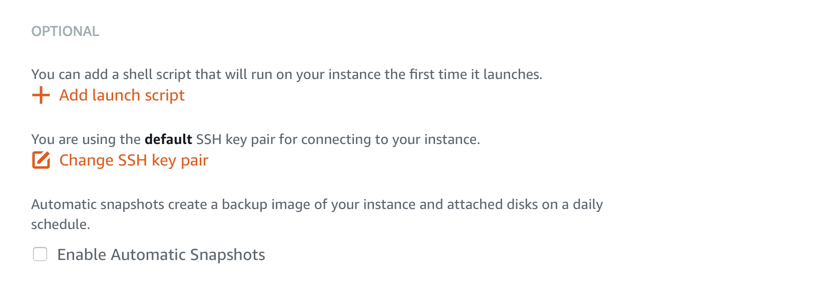- SSH Key Pair Manager: Choose Default to use the default key pair that Lightsail creates to connect to your Linux instance. When you create an instance in an AWS Region, Lightsail creates a region-specific default key. You can download the default private key if you also want to connect to your Lightsail instance using an SSH client such as PuTTY.