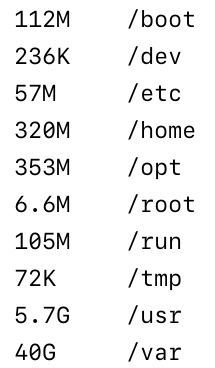 As you can see, the /var directory consumes 40 GB, dwarfing the amount of data in the other directories. So, we run du again on /var.