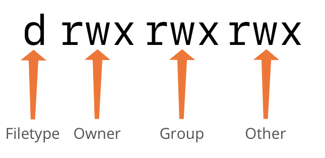 The leftmost letter indicates the filetype. Here it’s a d so we know the file is a directory. If it was a normal file there would be a dash (-) in this column, as you can see in the first image.