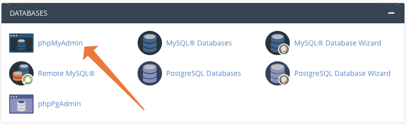 Fortunately, that’s easy to do in cPanel. First, fire up phpMyAdmin, which you’ll find in the Databases section of the cPanel main page.