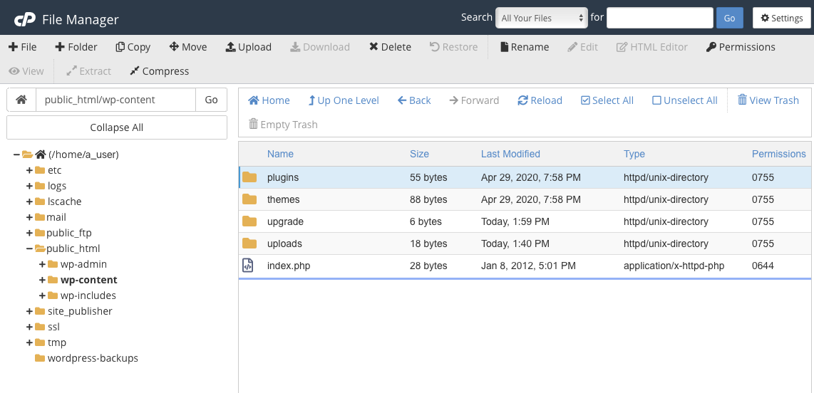 The strategy is to rename the folder that contains the plugin files. WordPress won’t be able to find the plugins, so they won’t be loaded.Open the cPanel File Manager from the Files section of the main page.
