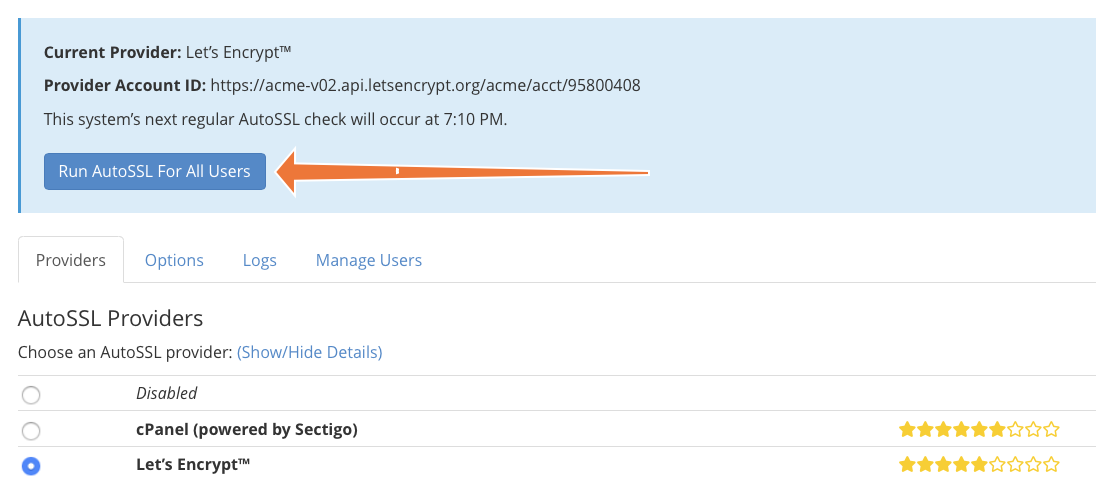 Return to Manage AutoSSL and click Run AutoSSL For All Users. cPanel will regenerate the removed certificates with replacements from the Let’s Encrypt provider.