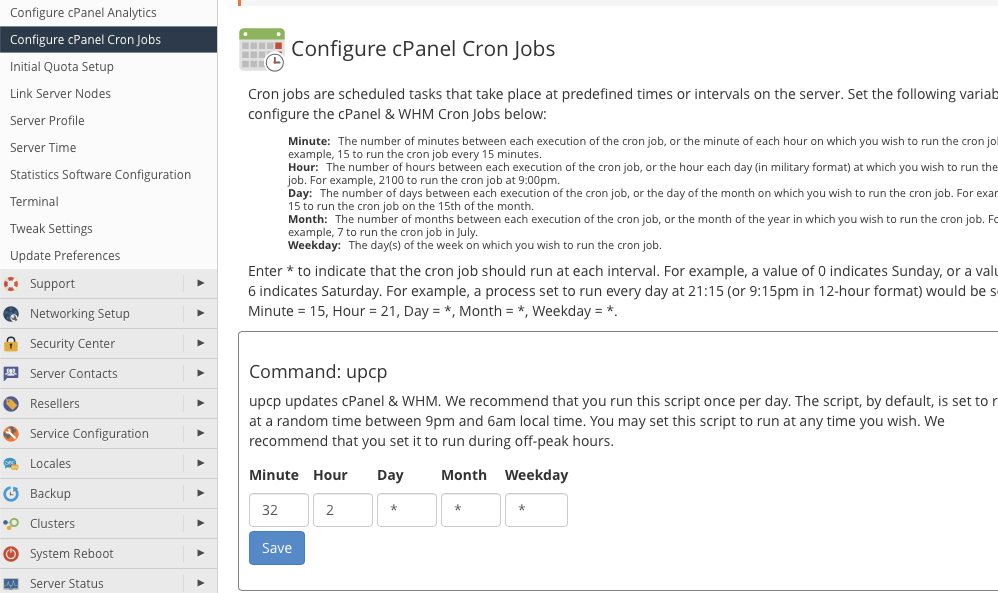 cPanel & WHM schedules several scripts, including the upcp update script, backup, and cpbackup. Server administrators can adjust when these scripts run in WHM.