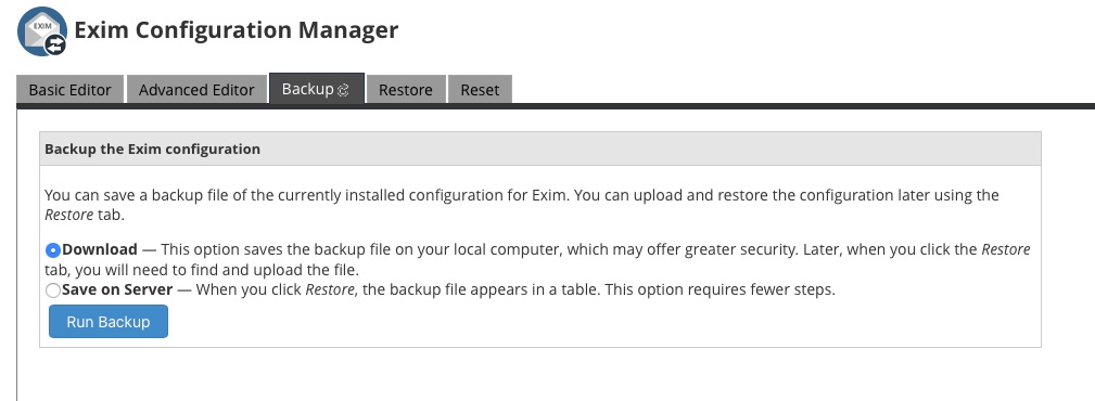 Before you make any changes, be sure to back up the current Exim configuration in the Backup tab.