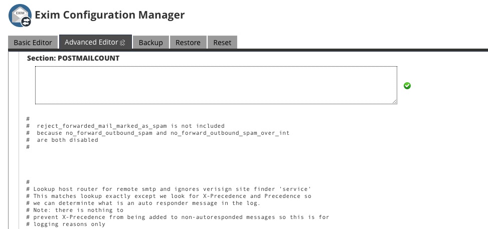 Next, we need to tell Exim where to send outgoing email. Search for “POSTMAILCOUNT,” and you will see a text box.