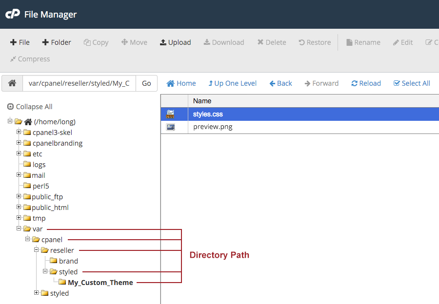 var/cpanel/reseller/styledif it doesn’t exist - Under styled folder – create your own folder name for the theme: ex: My_Custom_Theme