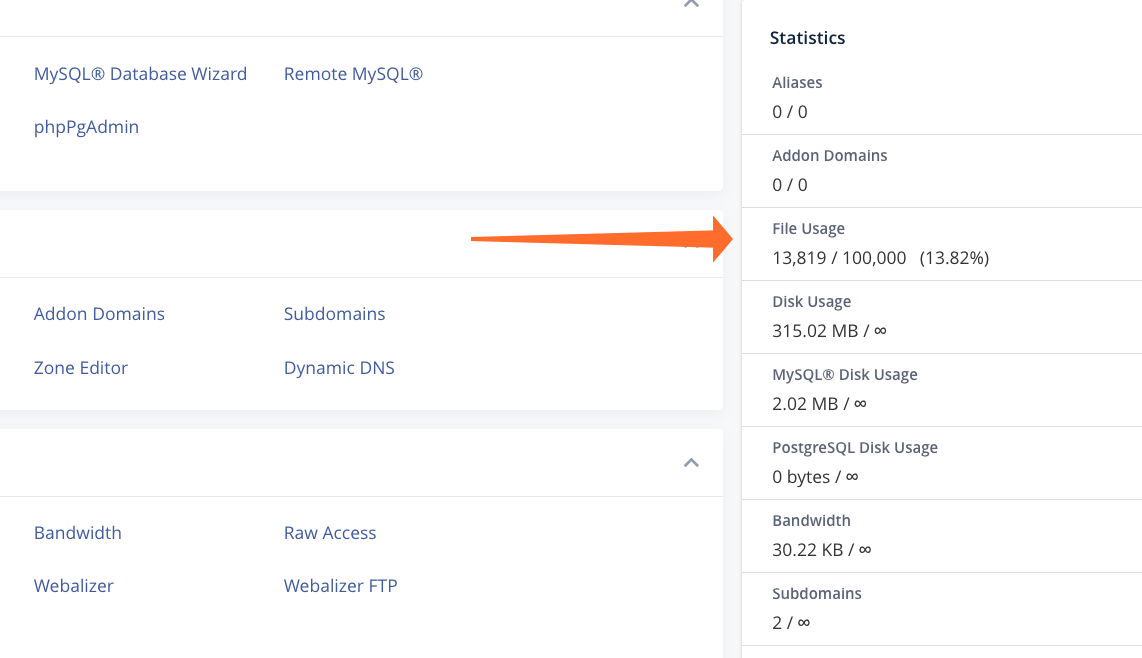 You can inform cPanel users of their inode limits with the Statistics sidebar’s File Usage feature. It displays both used inodes and available inodes, allowing users to manage file numbers when they approach their limit.