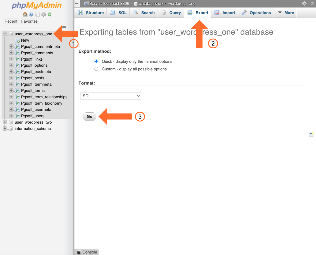 - Select the Export tab and make sure the Quick export method is selected. The custom method lets you change database export options, but we’ll stick with the defaults.
