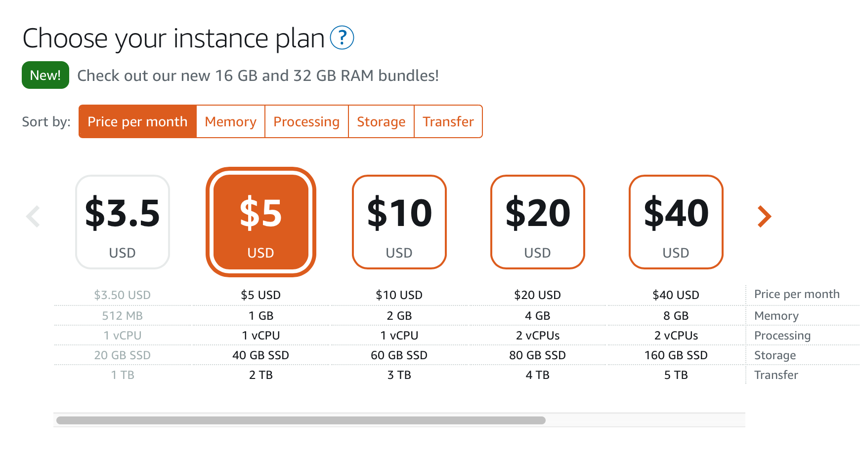 Next, we choose our Lightsail plan. AWS currently offers Lightsail plans starting at $5 a month up to $160 per month, depending on your requirements. In order to ensure that you have an optimal experience with cPanel, Lightsail does not support the cPanel bundle on the $3.50 plan.