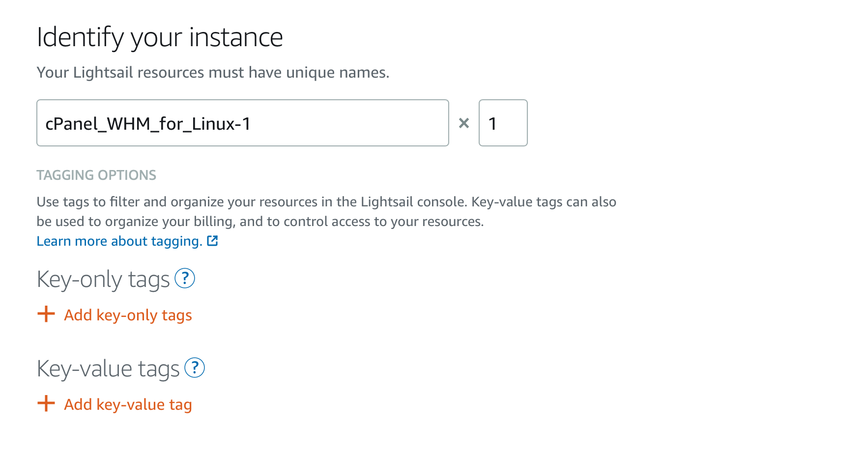Now we need to select a unique name to identify our instance. You also have the option to use tags to filter and organize your resources in the Lightsail console. Key-value tags can also be used to organize your billing, and to control access to your resources.