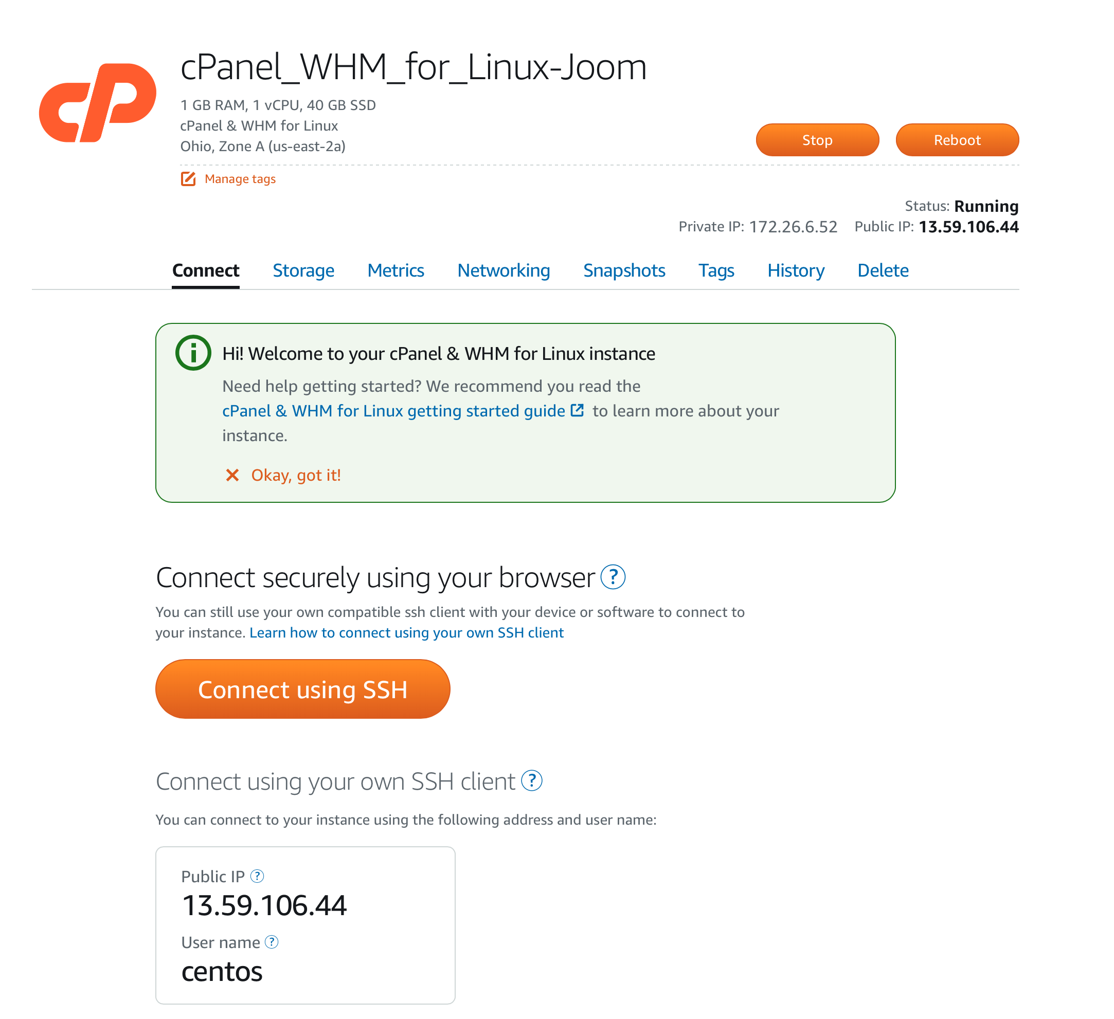 Now you have cPanel & WHM installed on an Amazon Lightsail instance! For more information on the next steps, you should take to get started after your cPanel & WHM instance is up and running on Amazon Lightsail, please view the AWS Lightsail cPanel & WHM Quick Start Guide