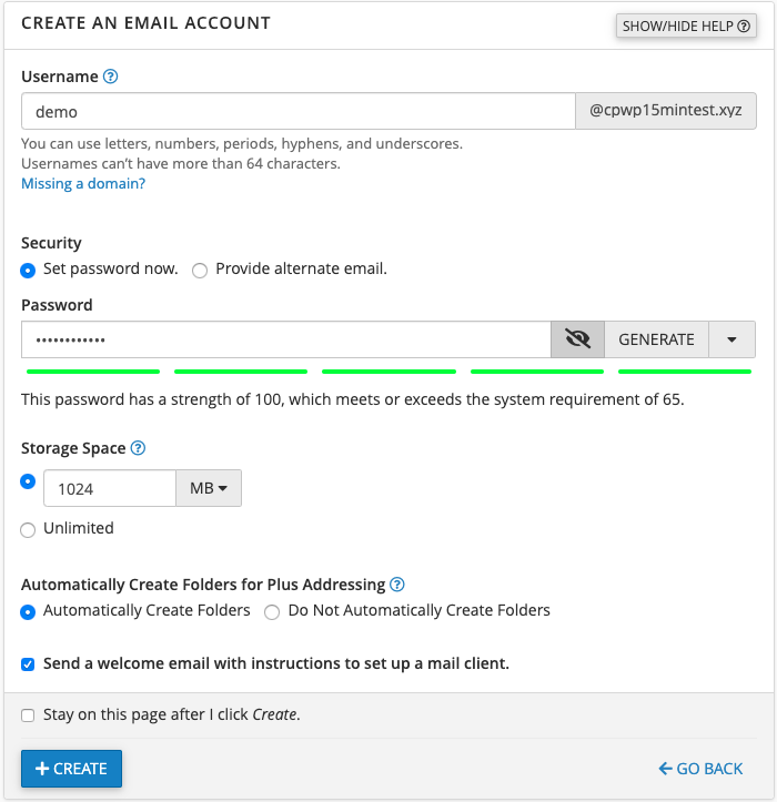 - Set a password for that email address. If you want to ensure the email account’s password exceeds the system’s minimum security score requirement of 65, click the GENERATE key to generate a strong password. Make sure you copy this password into your password storage software of choice.