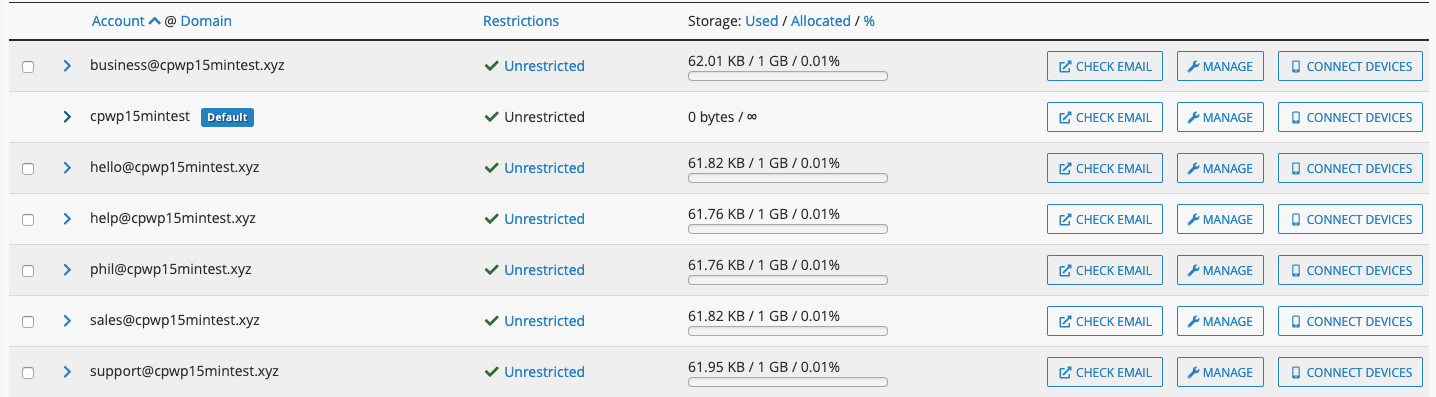 In the Email Accounts section of cPanel, you’ll see a list of email accounts you’ve created, their restrictions, the amount of storage each email account is using, and a handful of tools. The leftmost box, “CHECK EMAIL,” is a direct link to the Webmail Portal. Click that button next to the email account you want to access Webmail. Simple as that!