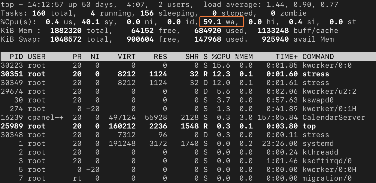 First, let’s see if the CPU is waiting for disk operations to complete. Type “top” and press enter. This launches the top tool, which shows server statistics and a list of running processes. The wa metric shows IO-wait, the amount of time the CPU spends waiting for IO completion represented as a percentage.