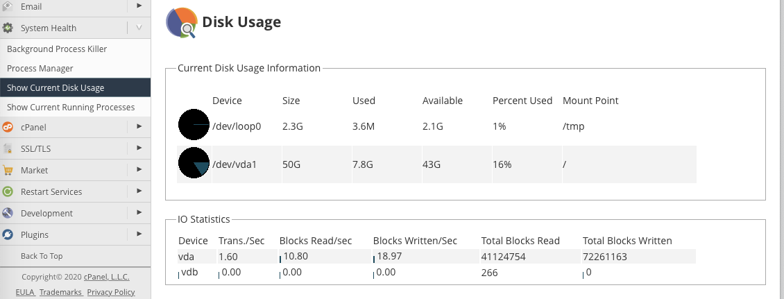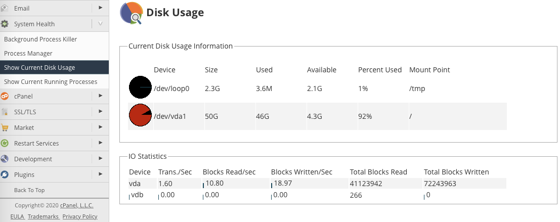 If we go back to WHM’s Disk Usage page, we see that the device is no longer full, and the problems caused by the lack of storage space have been resolved.