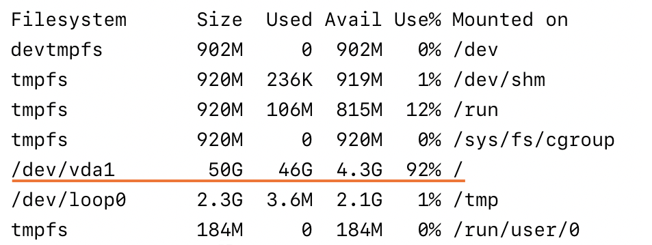 You can ignore the tmpfs devices; they’re virtual disks stored in memory and may not be present on your server. We’ve underlined the interesting entry: the disk named /dev/vda1, which is mounted on the root (/) of the filesystem, is 92 percent full.
