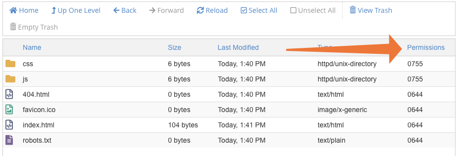 File permissions are displayed in the rightmost column of the File Manager, using the numerical notation.