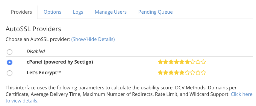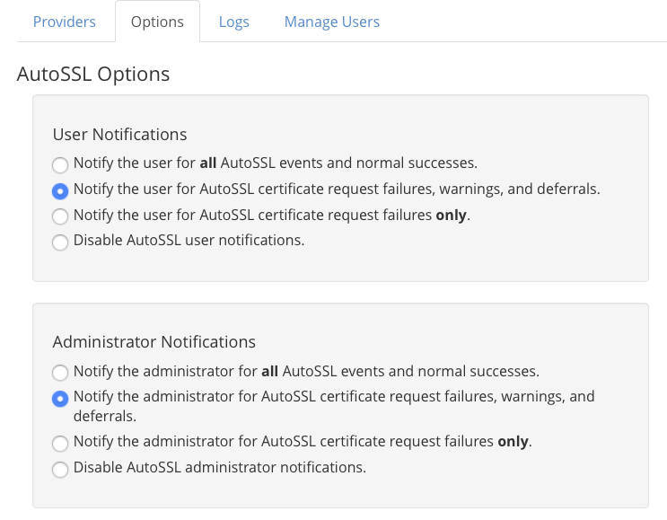 However, there are some cPanel Let’s Encrypt plugin configurations you may want to adjust. You will find them under the Options tab in Manage AutoSSL. Here, you can configure user and administrator notifications for AutoSSL events, including request failures and other issues.