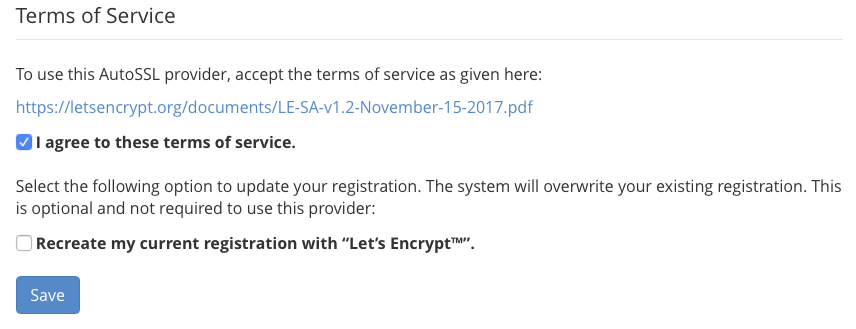 Before you can use Let’s Encrypt, you will have to agree to the provider’s terms of service. There is also an option to “Recreate my current registration with Let’s Encrypt.” This is only necessary if your license has expired or been corrupted, so there is no need to select it now.