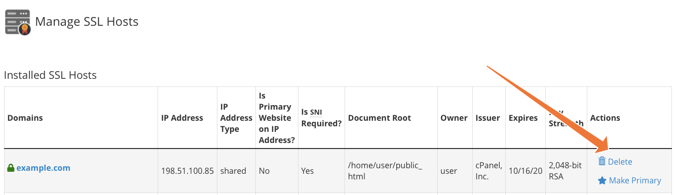 If you would like to immediately replace the server’s existing certs with new ones from Let’s Encrypt, manually remove the old ones by navigating to Manage SSL Hosts under SSL/TLS in the sidebar menu. Be aware that when you remove certificates, their associated sites will not be available at a secure HTTPS URL until they are replaced.