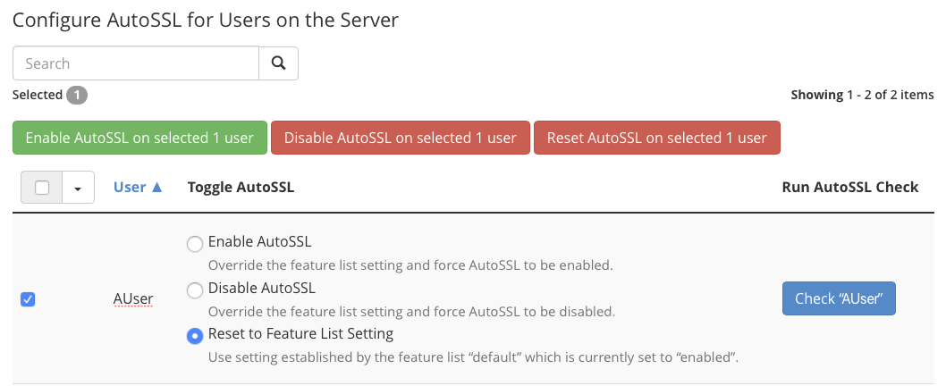 Finally, under the Manage Users tab, you can configure which cPanel users benefit from AutoSSL.