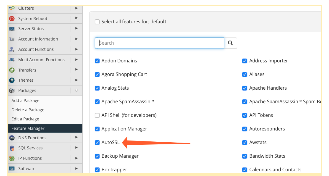 Here you can enable or disable AutoSSL for individual cPanel users, and reset to the default configured in the Feature List Settings. AutoSSL is turned on for all users by default, but you can change that in the Feature Manager, which you can find under Packages in the WHM sidebar menu.