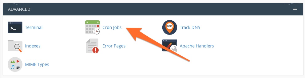 In cPanel, select Cron Jobs in the Advanced section of the Main Page menu.