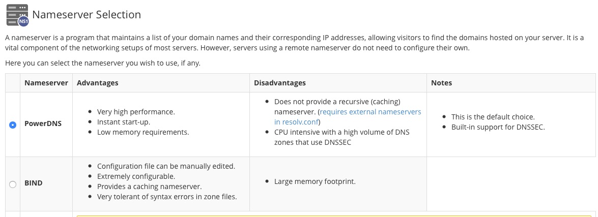 cPanel integrates the PowerDNS nameserver, a high-performance server with low memory requirements. PowerDNS is the default, but you can also select BIND if you need recursive DNS or to edit zone files manually.
