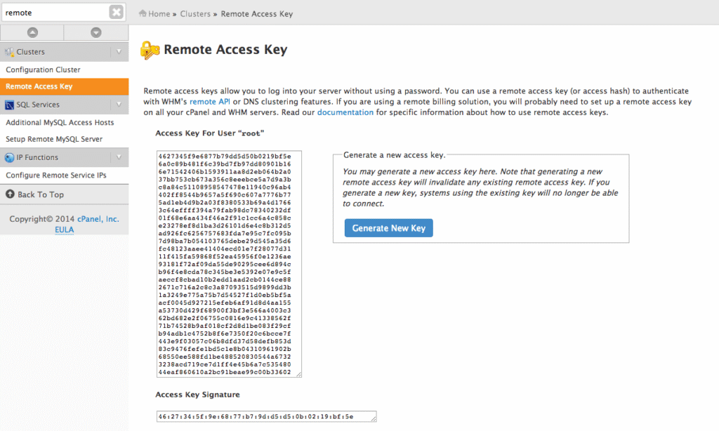 Since this code will be called from a file we need to have a way to interact with WHM so we use an access hash so our commands are authenticated just as if we were clicking items in the WHM interface. An access hash is a way for a program to access a server without having to use the root password. This hash is used for several things in the cPanel system, most notably setting up DNS Clusters. To create this hash you can visit WHM >> Remote Access Key. There is likely a key already in place on your server – if this is the case it’s best to just use what already exists. If there isn’t a key in place you can generate one with the blue “Generate New Key” button on the right.