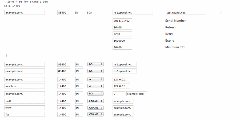 In general, when working with JSON, “1” indicastes positive output, meaning the action completed successfully. We can see from this output that the domain was accepted and example.com has been created on the server. If we check out WHM >> Edit a DNS Zone you should see example.com in your list now, and selecting it will show a zone file with all the default cPanel records: