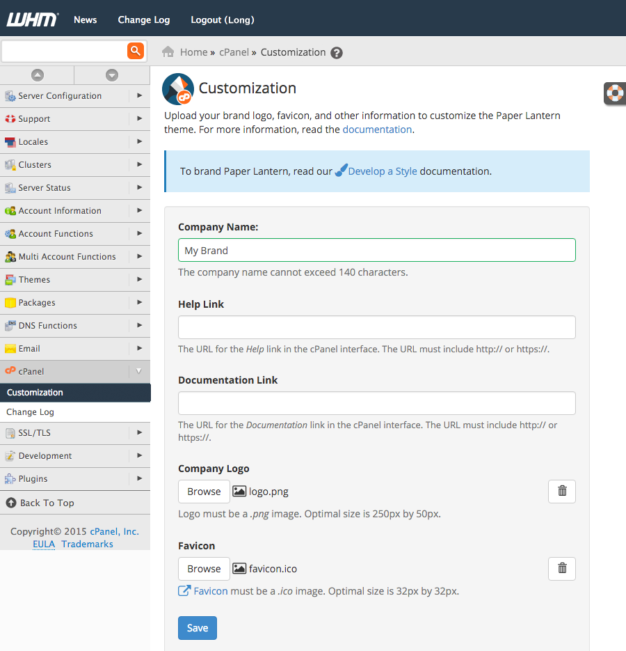 cPanel > Customization - Type in your company name