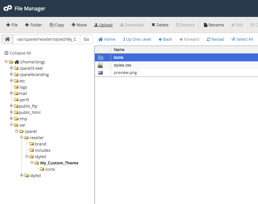 var/cpanel/reseller/styledif it doesn’t exist - Under styled folder – create your own folder name for the theme: ex: My_Custom_Theme