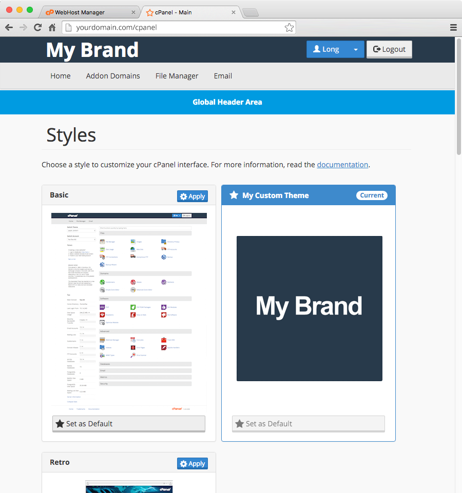 The last step is to set your default style to your own custom design. Simply go to User Preferences > Change Style > Set as Default on one of your custom designs. Once enabled, new and existing hosting account will automatically see your the new custom branded dashboard.