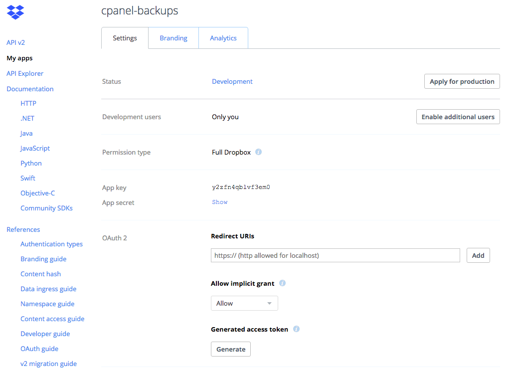 If you don’t already have a Dropbox account, create one here. Once you have an account, head over to their developer section to create an app (this is required to use their API). You’ll be prompted to select the typical Dropbox API or the Business API. For our testing purposes, we’ll stick with the free Dropbox API. For step two of the app creation process, select Full Dropbox. Finally, set a name for your app; I chose ‘cpanel-backups.’