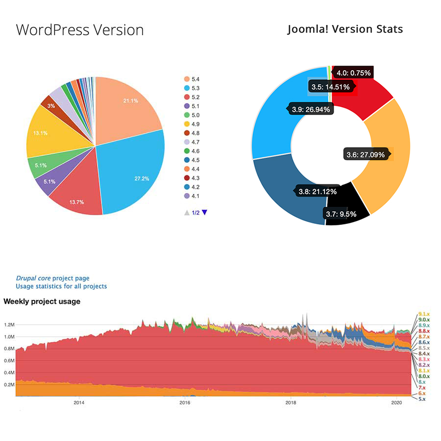 As seen in the charts above, around 80% of WordPress and Joomla users are using an older version of the platform. WordPress has been the leader over the past decade with auto-updates and a fantastic backward compatibility record.