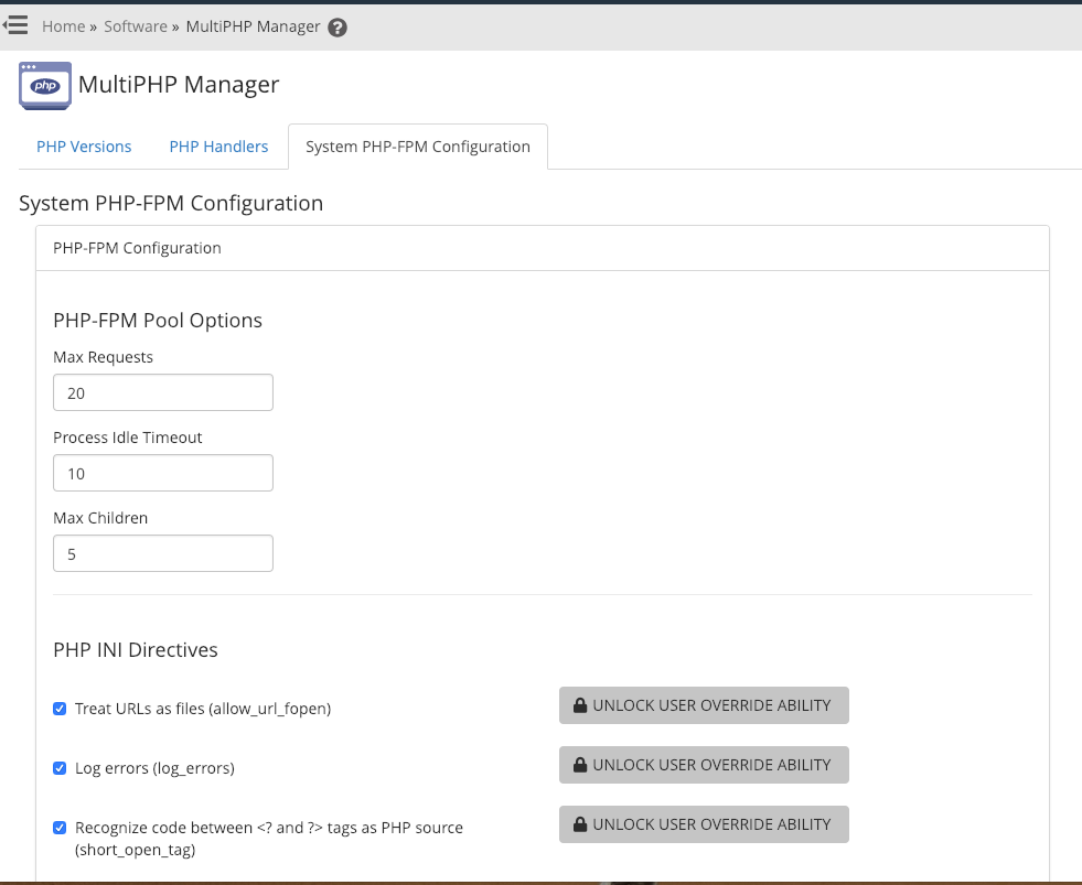 In version 78, we’ve added the ability to automatically configure some PHP INI settings directly from WHM’s MultiPHP Manager Interface (WHM >> Home >> Software >> MultiPHP Manager). The new System PHP-FPM Configuration tab allows WHM users to set the system’s PHP INI directives (if you’re a systems administrator, these can still be updated manually through the command line).