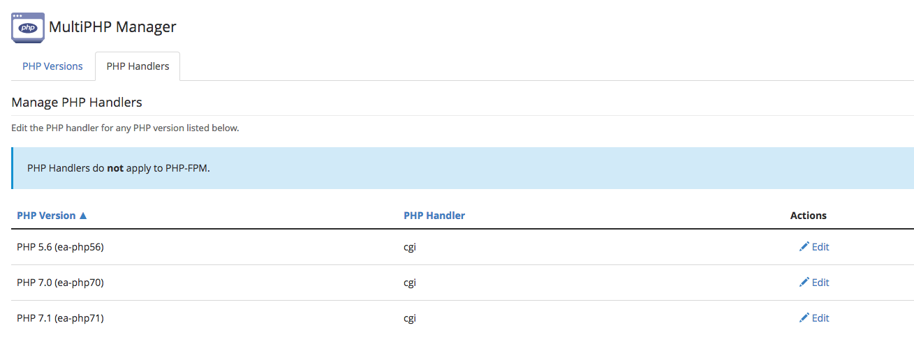 In EasyApache 4, each PHP version can use a PHP handler (a type of Apache module that contains libraries that the Apache webserver can use to interpret and run PHP code). The PHP Handlers tab allows you to select the PHP handler that each version of PHP uses. So if there was a scenario where a user wanted a certain Apache module on one version of PHP, but not another, the MultiPHP Manager feature makes this possible. With the flexibility of PHP Handlers, you can allow users to run whichever versions of PHP that you make available to them.