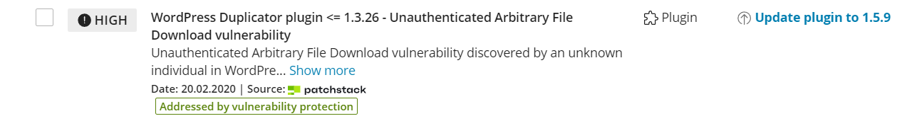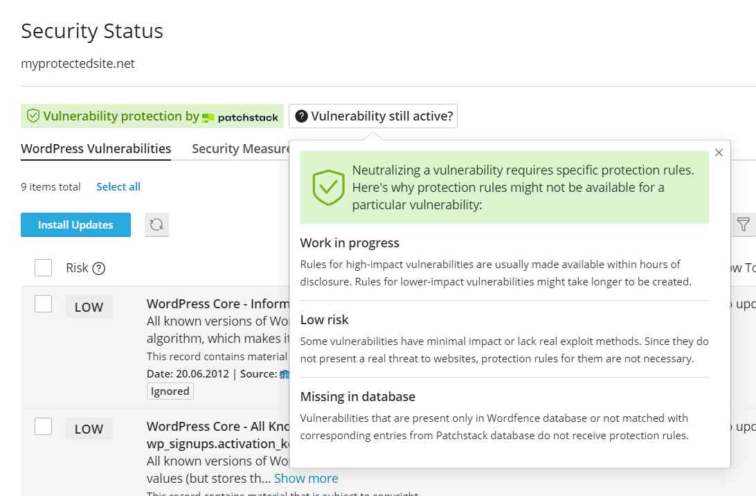 - Missing in database. Vulnerability protection is powered by technology provided by our security partners from Patchstack, so it works with vulnerabilities in Patchstack database. Vulnerabilities that are present only in Wordfence database or not matched with corresponding entries from Patchstack database do not receive protection rules. We’re working on matching all possible duplicates between two databases, but it will take us some time, since there are thousands of entries to be matched.